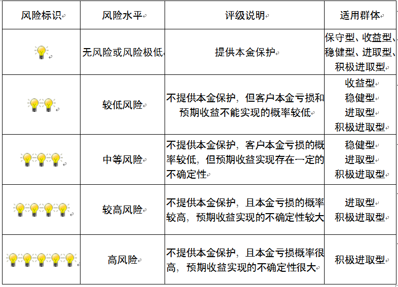 本产品为非保本浮动收益型理财产品,不保证本金和收益,请您充分认识投资风险,谨慎投资。本期产品期限为111天(中国建设银行有权对产品进行展期或提前终止),存续期内,产品不接受申购或赎回申请。本期产品内部风险评级级别为盏警示灯,风险水平属于较低风险。最不利情况下,您将损失全部收益甚至包括全部本金。本理财产品适用于收益型、稳健型、进取型 、积极进取型客户。
