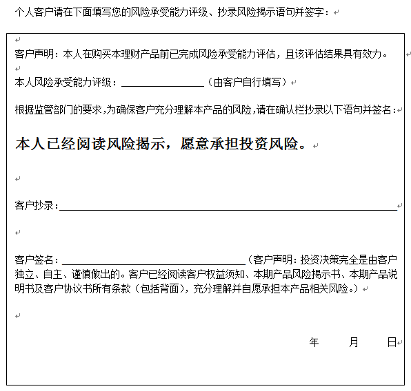 您签署本风险揭示书、客户协议书,并将资金委托给中国建设银行运作是您真实的意思表示。本风险揭示书及相应的客户协议书、产品说明书、客户权益须知将共同构成贵我双方理财合同的有效组成部分。