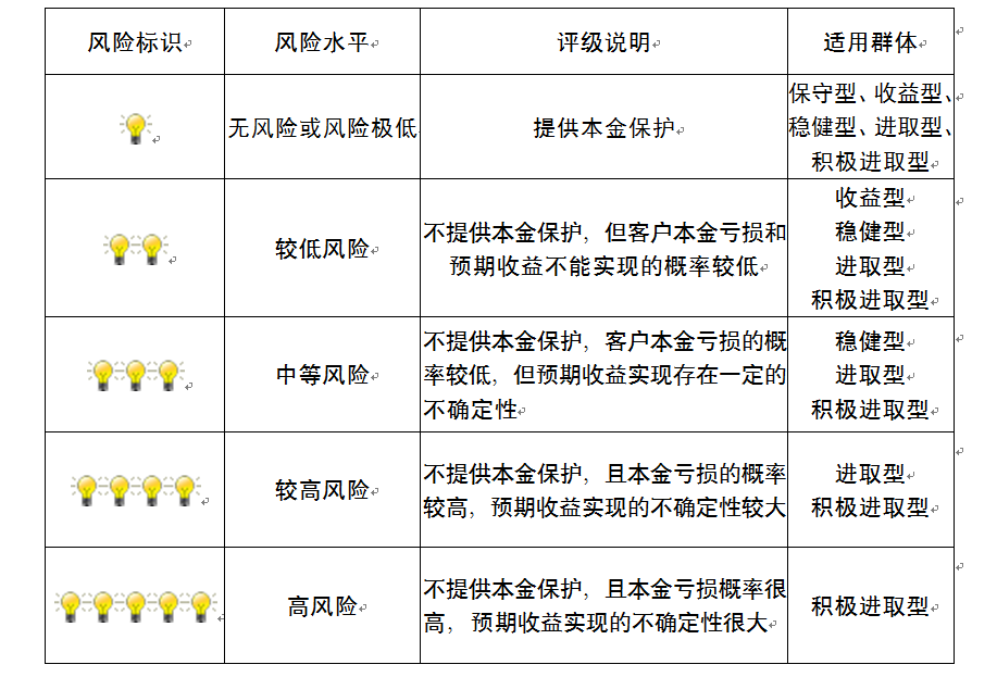 本产品为非保本浮动收益型理财产品,不保证本金和收益,请您充分认识投资风险,谨慎投资。本期产品期限为90天(中国建设银行有权对产品进行展期或提前终止),存续期内,产品不接受申购或赎回申请。本期产品内部风险评级级别为盏警示灯,风险水平属于较低风险。最不利情况下,您将损失全部收益甚至包括全部本金。本理财产品适用于收益型、稳健型进取型 积极进取型客户。