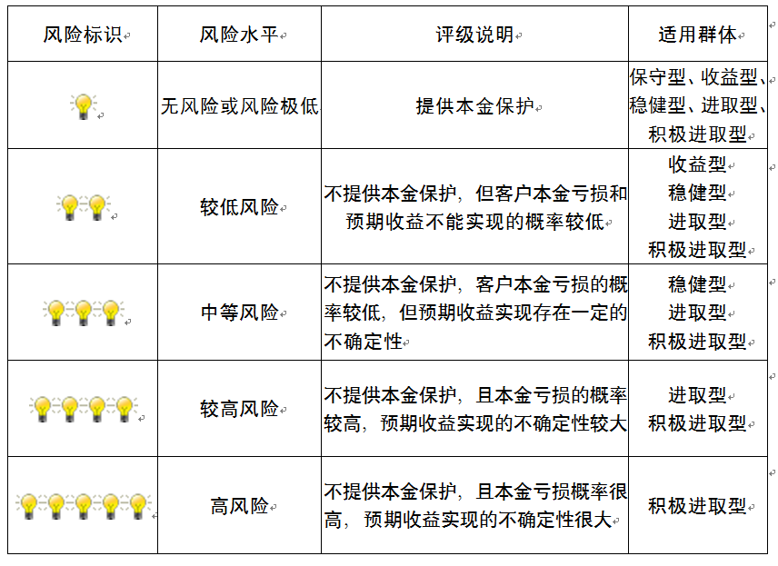 本产品为非保本浮动收益型理财产品,不保证本金和收益,请您充分认识投资风险,谨慎投资。本期产品期限为188天(中国建设银行有权对产品进行展期或提前终止),存续期内,产品不接受申购或赎回申请。本期产品内部风险评级级别为盏警示灯,风险水平属于中等风险。最不利情况下,您将损失全部收益甚至包括全部本金。本理财产品适用于稳健型进取型 积极进取型客户。
