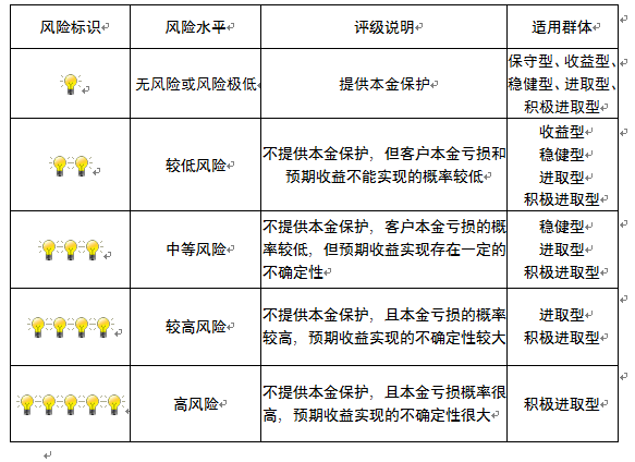 本产品为非保本浮动收益型理财产品,不保证本金和收益,请您充分认识投资风险,谨慎投资。本期产品期限为94天(中国建设银行有权对产品进行展期或提前终止),存续期内,产品不接受申购或赎回申请。本期产品内部风险评级级别为盏警示灯,风险水平属于较低风险。最不利情况下,您将损失全部收益甚至包括全部本金。本理财产品适用于收益型、稳健型进取型 积极进取型客户。