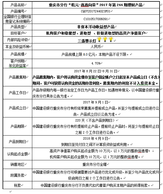 中国建设银行重庆市分行“乾元-鑫鑫向荣” 2017年第244期理财产品风险揭示书和产品说明书