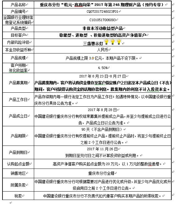 中国建设银行重庆市分行“乾元-鑫鑫向荣” 2017年第246期理财产品风险揭示书和产品说明书