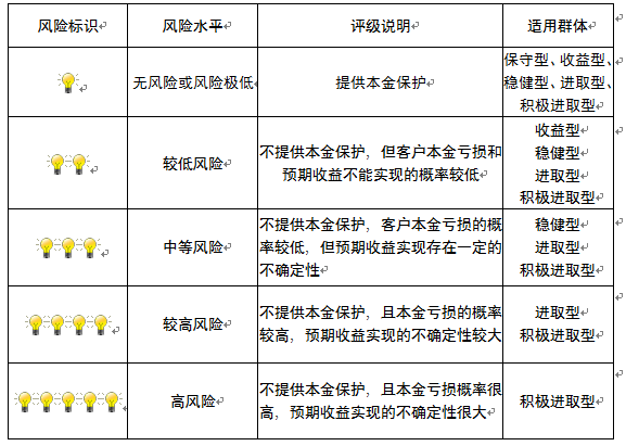 本产品为非保本浮动收益型理财产品,不保证本金和收益,请您充分认识投资风险,谨慎投资。本期产品期限为94天(中国建设银行有权对产品进行展期或提前终止),存续期内,产品不接受申购或赎回申请。本期产品内部风险评级级别为盏警示灯,风险水平属于中等风险。最不利情况下,您将损失全部收益甚至包括全部本金。本理财产品适用于稳健型进取型 积极进取型客户。