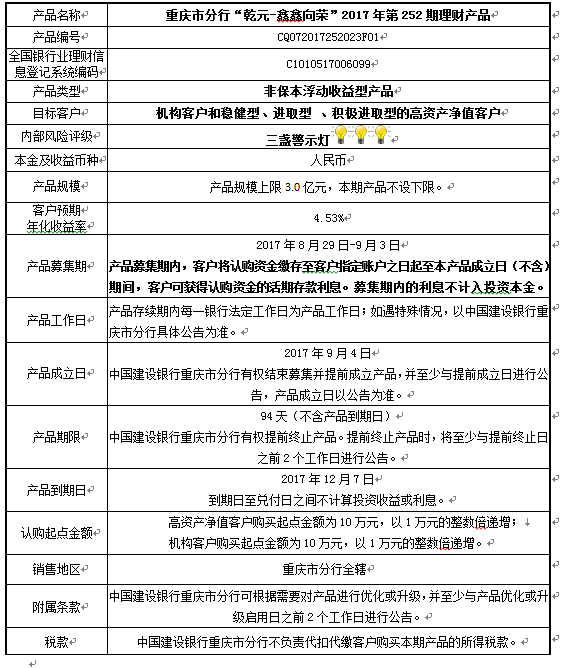 中国建设银行重庆市分行“乾元-鑫鑫向荣” 2017年第252期理财产品风险揭示书和产品说明书
