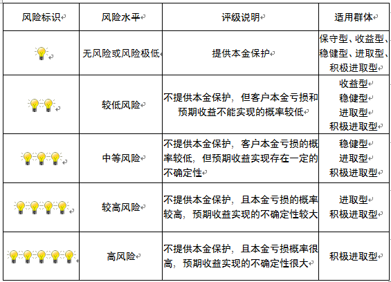 本产品为非保本浮动收益型理财产品,不保证本金和收益,请您充分认识投资风险,谨慎投资。本期产品期限为146天(中国建设银行有权对产品进行展期或提前终止),存续期内,产品不接受申购或赎回申请。本期产品内部风险评级级别为盏警示灯,风险水平属于较低风险。最不利情况下,您将损失全部收益甚至包括全部本金。本理财产品适用于收益型、稳健型进取型 积极进取型客户。