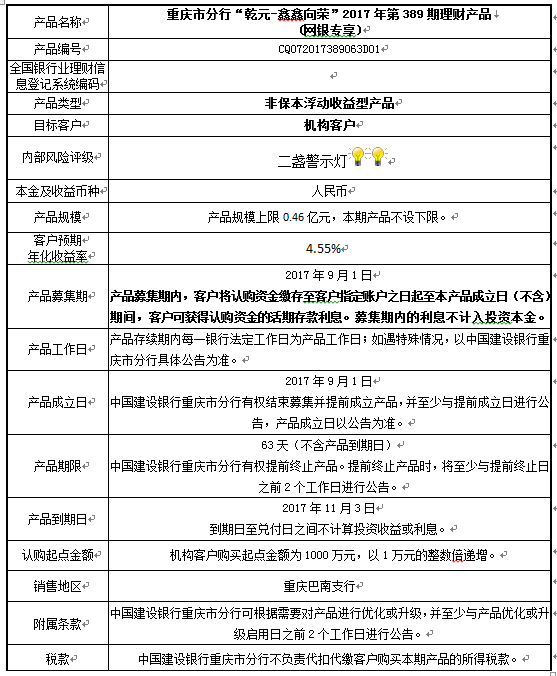 1.本期产品规模上限:0.46亿元。在本期产品募集期内,对本期产品的认购金额达到本期理财产品规模上限,则中国建设银行重庆市分行有权利但无义务停止本期产品的认购,已经认购成功的客户投资权益不受影响。