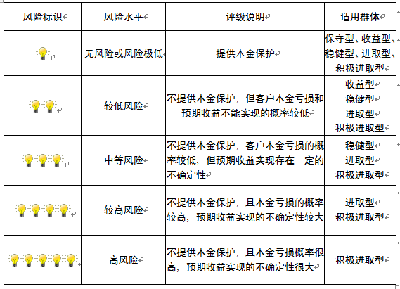 本产品为非保本浮动收益型理财产品,不保证本金和收益,请您充分认识投资风险,谨慎投资。本期产品期限为293天(中国建设银行有权对产品进行展期或提前终止),存续期内,产品不接受申购或赎回申请。本期产品内部风险评级级别为盏警示灯,风险水平属于中等风险。最不利情况下,您将损失全部收益甚至包括全部本金。本理财产品适用于稳健型进取型 积极进取型客户。