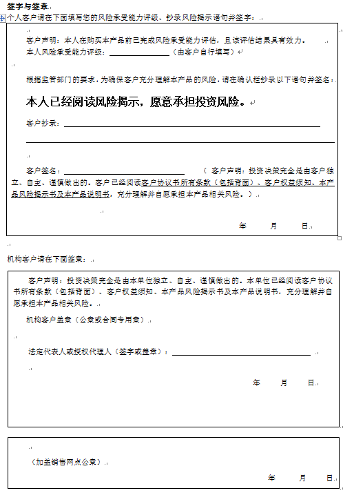 您签署本风险揭示书、客户协议书,并将资金委托给中国建设银行重庆市分行运作是您真实的意思表示。本风险揭示书及相应的客户协议书、产品说明书、客户权益须知将共同构成贵我双方理财合同的有效组成部分。