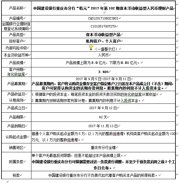 1.本产品规模上限:2.0亿元。在本期产品募集期内,对本期产品的认购金额达到本期理财产品规模上限,则中国建设银行重庆市分行有权利但无义务停止本期产品的认购,已经认购成功的客户投资权益不受影响。