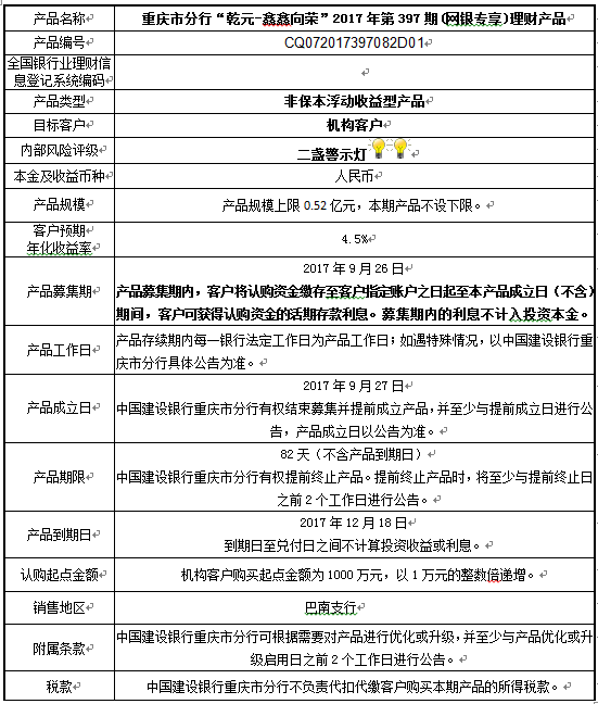 中国建设银行重庆市分行“乾元-鑫鑫向荣” 2017年第397期(网银专享)理财产品风险揭示书和产品说明书