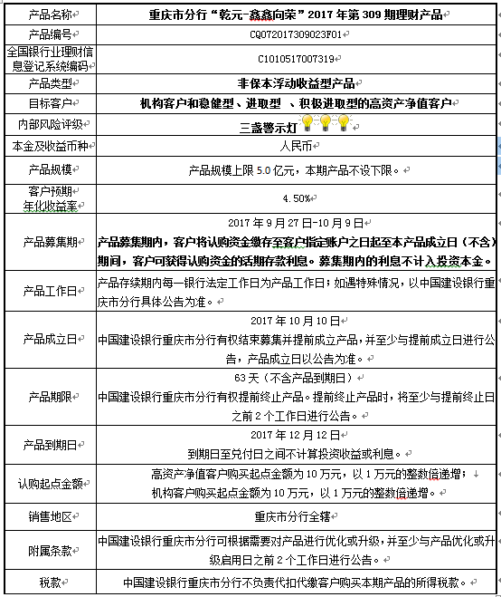 中国建设银行重庆市分行“乾元-鑫鑫向荣” 2017年第309期理财产品风险揭示书和产品说明书