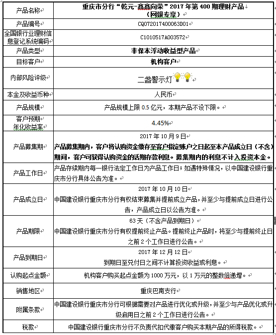 中国建设银行重庆市分行“乾元-鑫鑫向荣” 2017年第400期理财产品风险揭示书和产品说明书
