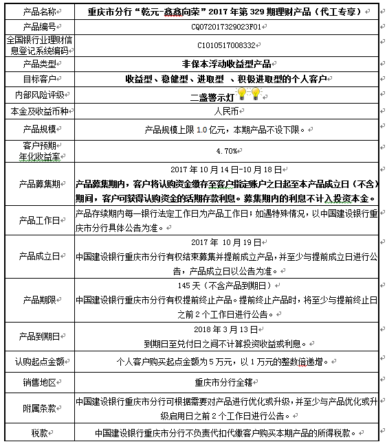 中国建设银行重庆市分行“乾元-鑫鑫向荣” 2017年第329期理财产品风险揭示书和产品说明书