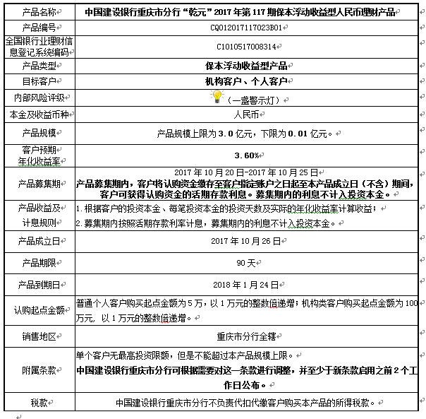 1.本产品规模上限:3.0亿元。在本期产品募集期内,对本期产品的认购金额达到本期理财产品规模上限,则中国建设银行重庆市分行有权利但无义务停止本期产品的认购,已经认购成功的客户投资权益不受影响。