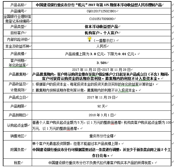中国建设银行重庆市分行“乾元”2017年第125期 保本浮动收益型人民币理财产品说明书