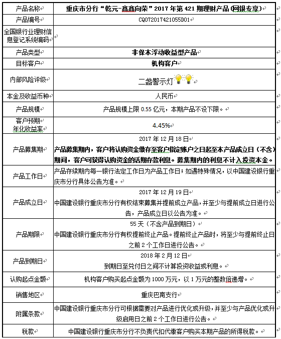 1.本期产品规模上限:0.55亿元。在本期产品募集期内,对本期产品的认购金额达到本期理财产品规模上限,则中国建设银行重庆市分行有权利但无义务停止本期产品的认购,已经认购成功的客户投资权益不受影响。