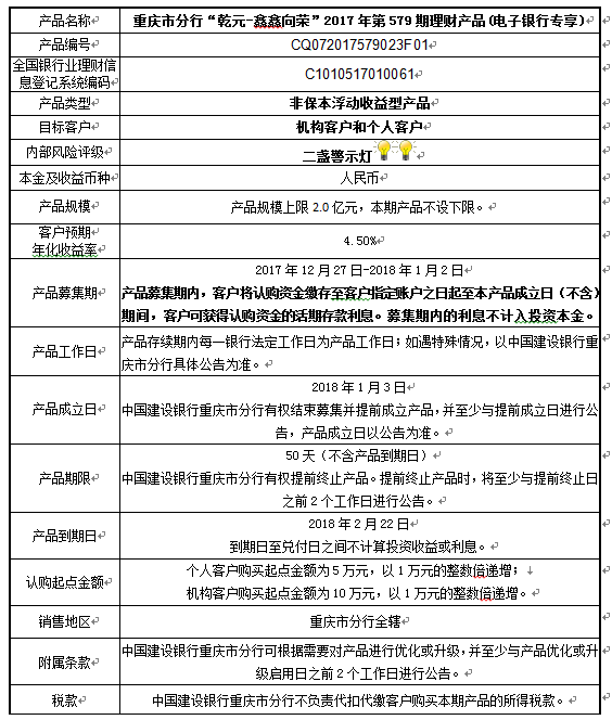 1.本期产品规模上限:2.0亿元。在本期产品募集期内,对本期产品的认购金额达到本期理财产品规模上限,则中国建设银行重庆市分行有权利但无义务停止本期产品的认购,已经认购成功的客户投资权益不受影响。