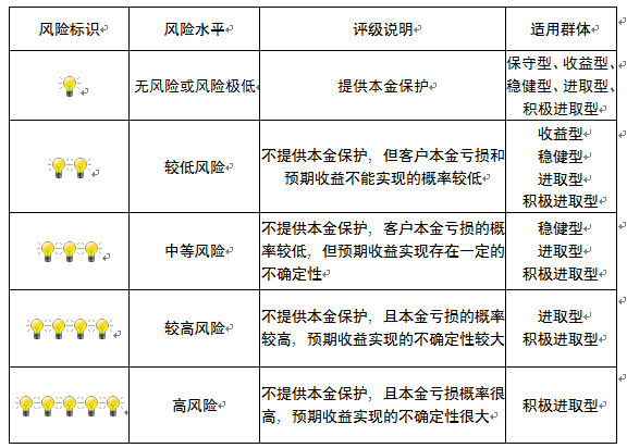 本产品为非保本浮动收益型理财产品,不保证本金和收益,请您充分认识投资风险,谨慎投资。本期产品期限为117天(中国建设银行有权对产品进行展期或提前终止),存续期内,产品不接受申购或赎回申请。本期产品内部风险评级级别为盏警示灯 ,风险水平属于较低风险。最不利情况下,您将损失全部收益甚至包括全部本金。本理财产品适用于收益型、稳健型、进取型 积极进取型客户。