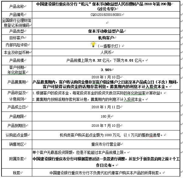 1.本产品规模上限:0.32亿元。在本期产品募集期内,对本期产品的认购金额达到本期理财产品规模上限,则中国建设银行重庆市分行有权利但无义务停止本期产品的认购,已经认购成功的客户投资权益不受影响。