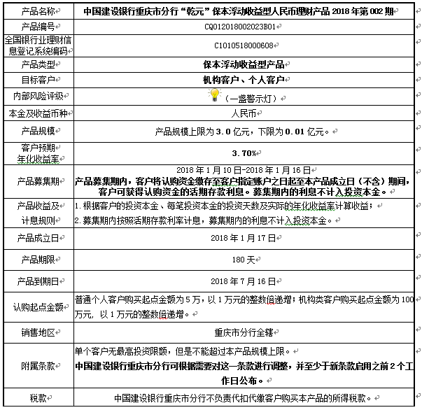 2.本产品规模下限:0.01亿元。在本期产品募集期内,对本期产品的认购金额未能达到本期理财产品规模下限,中国建设银行重庆市分行有权利但无义务宣布本期产品不成立。如产品不成立,中国建设银行重庆市分行将在通知客户产品不成立后1个工作日内返还客户已缴纳的认购本金至客户指定账户,客户应确保账户状态正常,并及时查询账户资金变动情况。