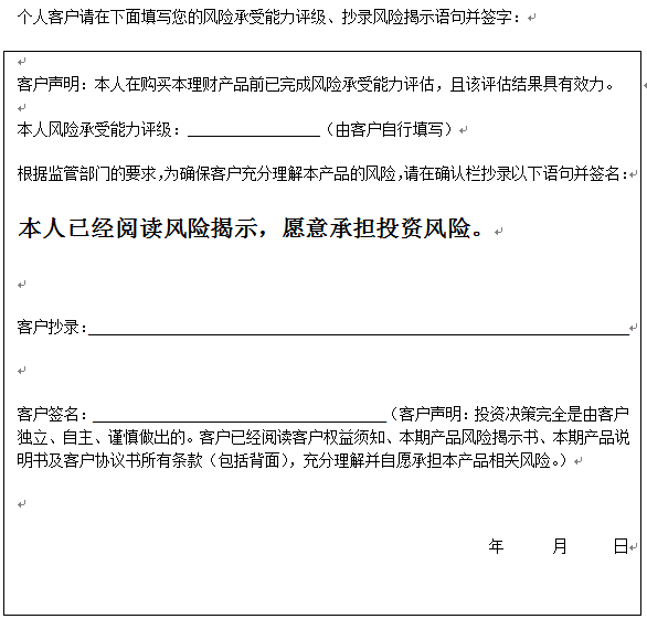 在您签署《中国建设银行股份有限公司理财产品客户协议书》前,应当仔细阅读客户权益须知、本风险揭示书及本产品的产品说明书的全部内容,同时向中国建设银行重庆市分行了解本产品的其他相关信息,并自己独立做出是否认(申)购本产品的决定。