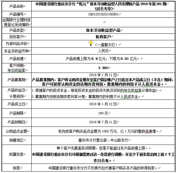 中国建设银行重庆市分行“乾元”保本浮动收益型 人民币理财产品2018年第201期风险揭示书和产品说明书