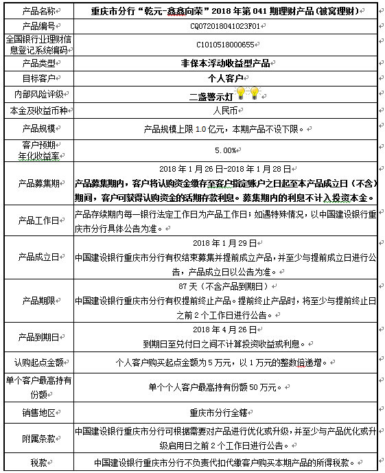 中国建设银行重庆市分行“乾元-鑫鑫向荣” 2018年第041期理财产品说明书和风险揭示书