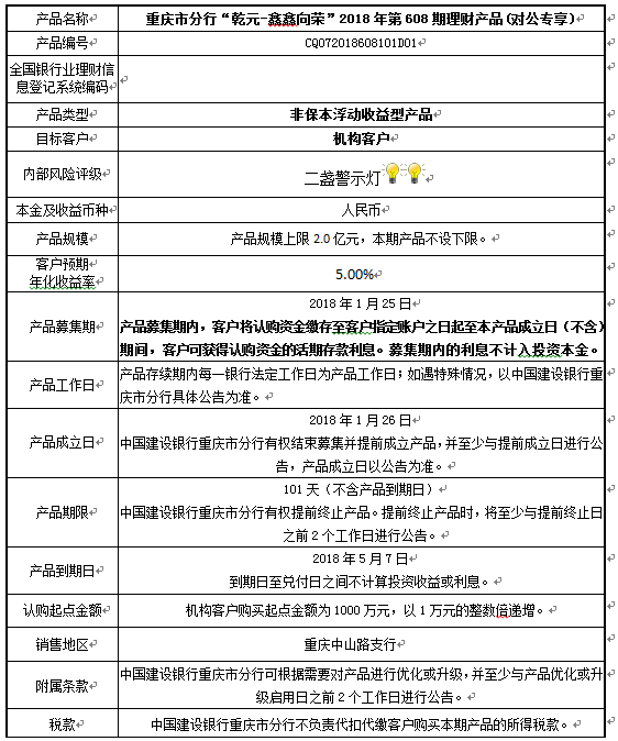 中国建设银行重庆市分行“乾元-鑫鑫向荣” 2018年第608期理财产品说明书和风险揭示书