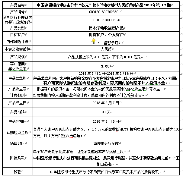 1.本产品规模上限:3.0亿元。在本期产品募集期内,对本期产品的认购金额达到本期理财产品规模上限,则中国建设银行重庆市分行有权利但无义务停止本期产品的认购,已经认购成功的客户投资权益不受影响。