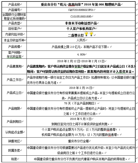 3.中国建设银行重庆市分行可根据市场情况等调整产品规模上、下限,并最迟于调整规模上下限当日进行公告。