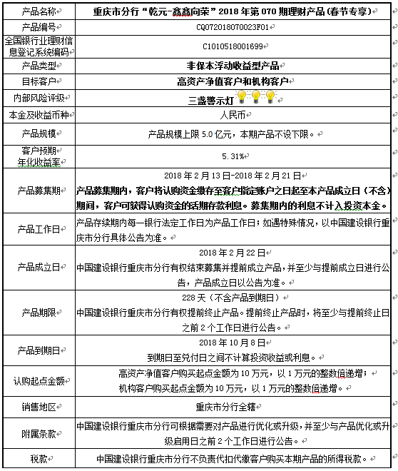 本产品为非保本浮动收益型理财产品,不保证本金和收益,请您充分认识投资风险,谨慎投资。本期产品期限为228天(中国建设银行有权对产品进行展期或提前终止),存续期内,产品不接受申购或赎回申请。本期产品内部风险评级级别为三盏警示灯