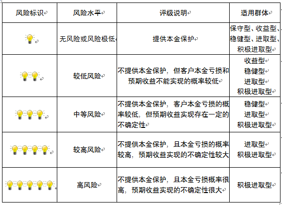 本产品为非保本浮动收益型理财产品,不保证本金和收益,请您充分认识投资风险,谨慎投资。本期产品期限为43天(中国建设银行有权对产品进行展期或提前终止),存续期内,产品不接受申购或赎回申请。本期产品内部风险评级级别为盏警示灯 ,风险水平属于较低风险。最不利情况下,您将损失全部收益甚至包括全部本金。本理财产品适用于收益型、稳健型、进取型 积极进取型客户。