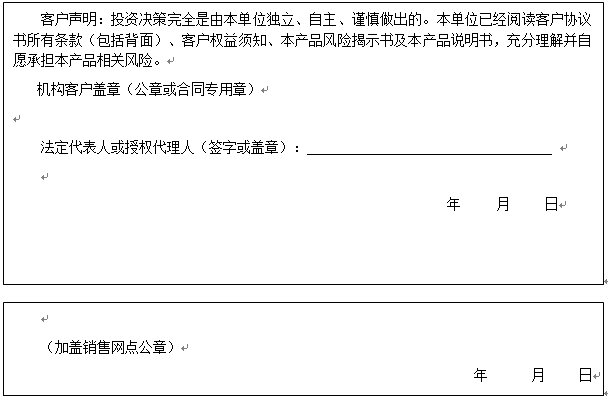 客户签名:                                   客户声明:投资决策完全是由客户独立、自主、谨慎做出的。客户已经阅读客户协议书所有条款(包括背面)、客户权益须知、本产品风险揭示书及本产品说明书,充分理解并自愿承担本产品相关风险。)