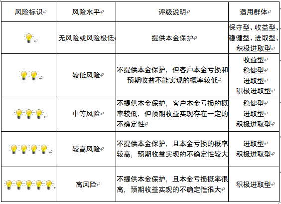 本产品为非保本浮动收益型理财产品,不保证本金和收益,请您充分认识投资风险,谨慎投资。本期产品期限为115天(中国建设银行有权对产品进行展期或提前终止),存续期内,产品不接受申购或赎回申请。本期产品内部风险评级级别为三盏警示灯 ,风险水平属于中等风险。最不利情况下,您将损失全部收益甚至包括全部本金。本理财产品适用于稳健型、进取型 、积极进取型客户。