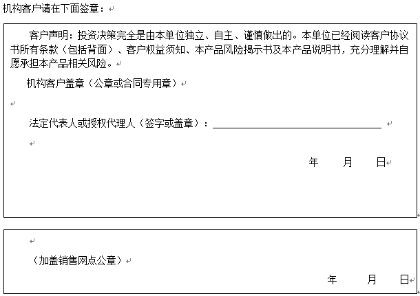 客户签名: ( 客户声明:投资决策完全是由客户独立、自主、谨慎做出的。客户已经阅读客户协议书所有条款(包括背面)、客户权益须知、本产品风险揭示书及本产品说明书,充分理解并自愿承担本产品相关风险。)
