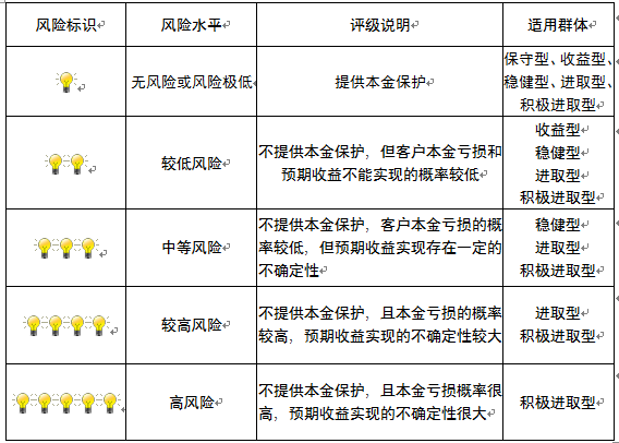 本产品为非保本浮动收益型理财产品,不保证本金和收益,请您充分认识投资风险,谨慎投资。本期产品期限为133天(中国建设银行有权对产品进行展期或提前终止),存续期内,产品不接受申购或赎回申请。本期产品内部风险评级级别为盏警示灯 ,风险水平属于较低风险。最不利情况下,您将损失全部收益甚至包括全部本金。本理财产品适用于收益型、稳健型、进取型 积极进取型客户。