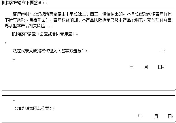 客户签名:                                   客户声明:投资决策完全是由客户独立、自主、谨慎做出的。客户已经阅读客户协议书所有条款(包括背面)、客户权益须知、本产品风险揭示书及本产品说明书,充分理解并自愿承担本产品相关风险。)
