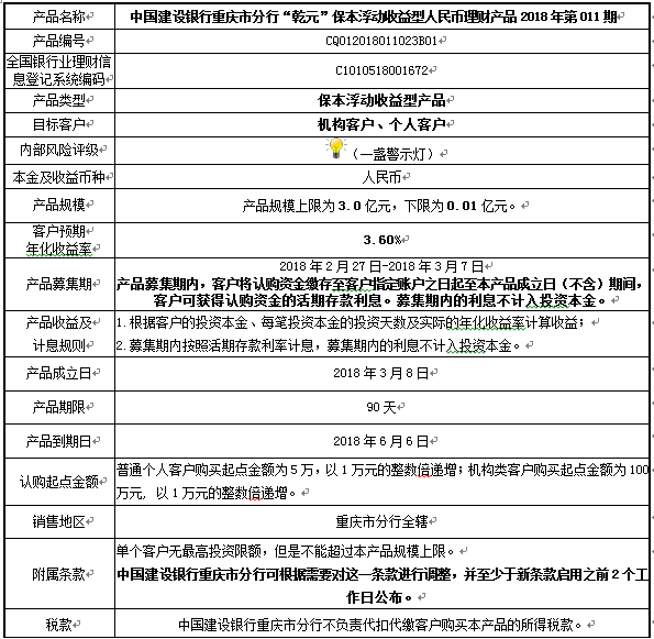 本期产品为保本浮动收益型理财产品,本理财产品有投资风险,只保障理财资金本金,不保证理财收益,您应当充分认识投资风险,谨慎投资。本期产品期限为90天(中国建设银行重庆市分行有权对产品进行展期或提前终止)。本期产品内部风险评级级别为一盏警示灯,风险程度属于无风险或风险极低,适用于保守型、收益型、稳健型、进取型及积极进取型投资者。最不利情况下,客户只能收回投资本金,不能获得任何投资收益。