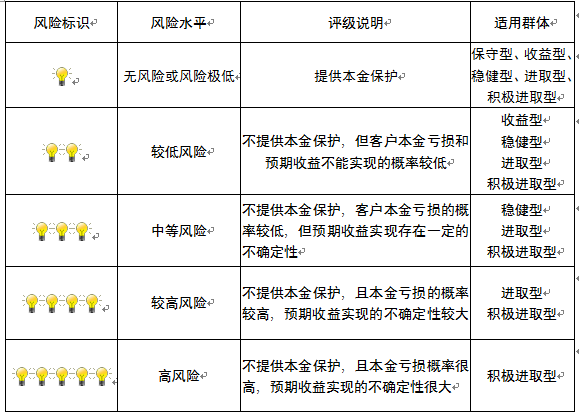 本产品为非保本浮动收益型理财产品,不保证本金和收益,请您充分认识投资风险,谨慎投资。本期产品期限为62天(中国建设银行有权对产品进行展期或提前终止),存续期内,产品不接受申购或赎回申请。本期产品内部风险评级级别为盏警示灯 ,风险水平属于较低风险。最不利情况下,您将损失全部收益甚至包括全部本金。本理财产品适用于收益型、稳健型、进取型 积极进取型客户。