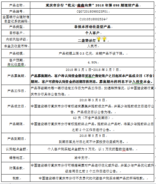 中国建设银行重庆市分行“乾元-鑫鑫向荣” 2018年第098期理财产品风险揭示书和产品说明书