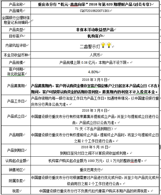 中国建设银行重庆市分行“乾元-鑫鑫向荣” 2018年第620期理财产品风险揭示书和产品说明书