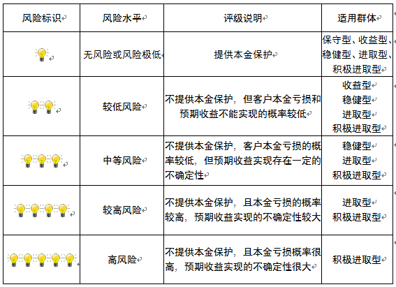 本产品为非保本浮动收益型理财产品,不保证本金和收益,请您充分认识投资风险,谨慎投资。本期产品期限为346天(中国建设银行有权对产品进行展期或提前终止),存续期内,产品不接受申购或赎回申请。本期产品内部风险评级级别为二盏警示灯 ,风险水平属于较低风险。最不利情况下,您将损失全部收益甚至包括全部本金。本理财产品适用于收益型、稳健型、进取型 、积极进取型客户。