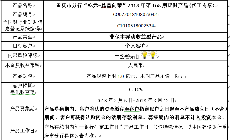 中国建设银行重庆市分行“乾元-鑫鑫向荣” 2018年第108期理财产品风险揭示书和说明书
