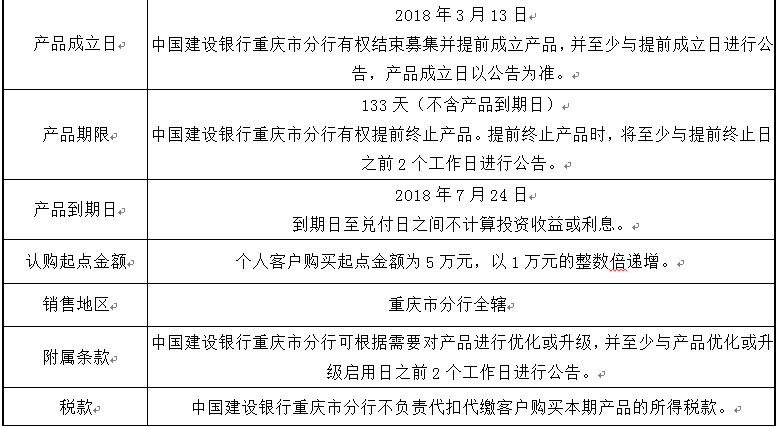 3.中国建设银行重庆市分行可根据市场情况等调整产品规模上、下限,并最迟于调整规模上下限当日进行公告。