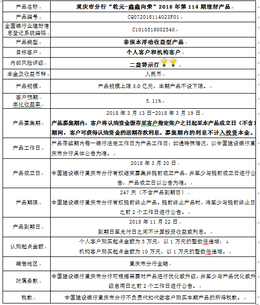 中国建设银行重庆市分行“乾元-鑫鑫向荣” 2018年第114期理财产品风险揭示书和说明书