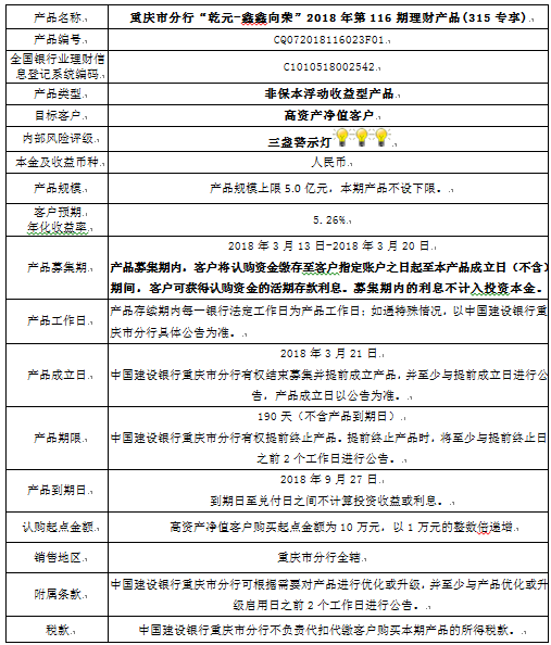 3.中国建设银行重庆市分行可根据市场情况等调整产品规模上、下限,并最迟于调整规模上下限当日进行公告。