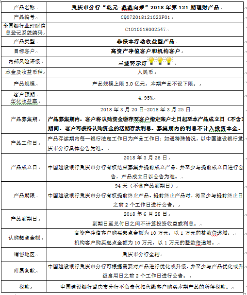 3.中国建设银行重庆市分行可根据市场情况等调整产品规模上、下限,并最迟于调整规模上下限当日进行公告。