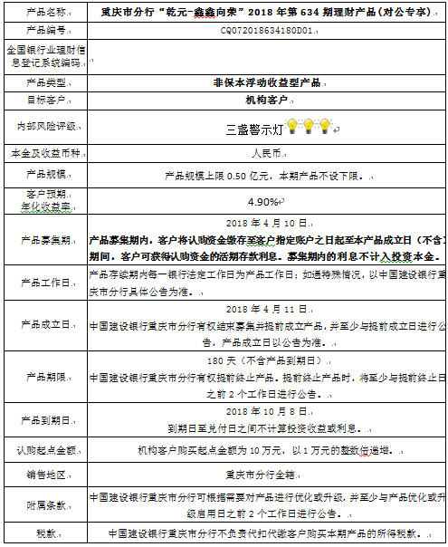3.中国建设银行重庆市分行可根据市场情况等调整产品规模上、下限,并最迟于调整规模上下限当日进行公告。