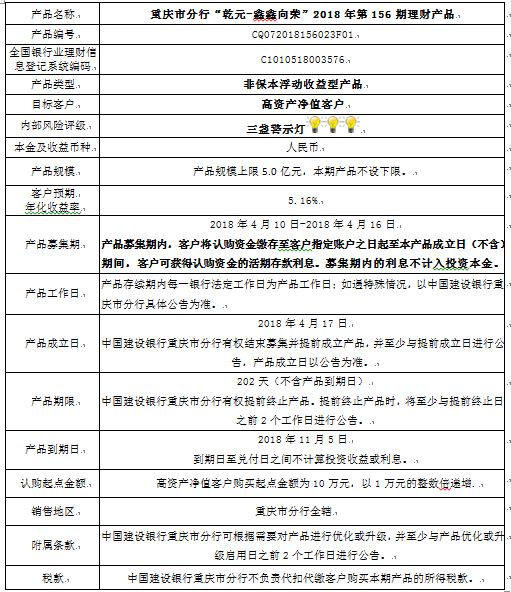 中国建设银行重庆市分行“乾元-鑫鑫向荣” 2018年第156期理财产品风险揭示书和说明书